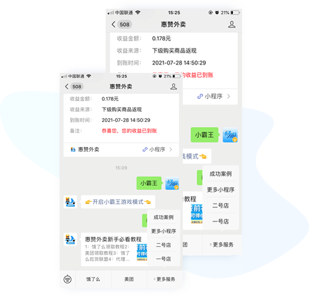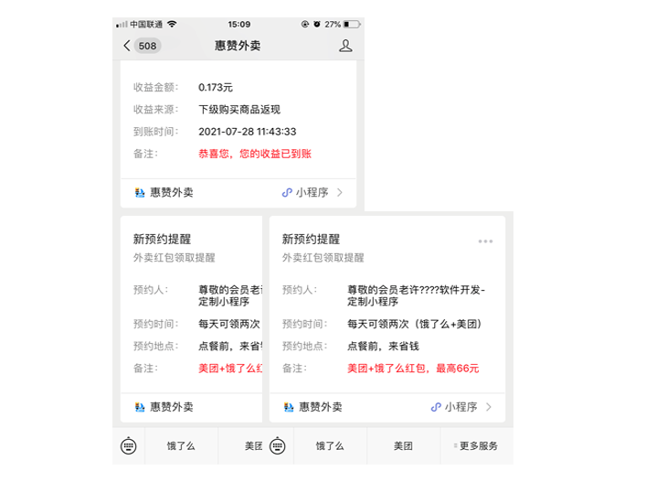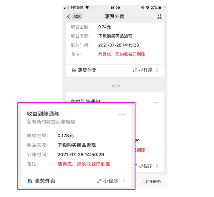 不仅下级消费会有提醒,如果上级消费也会有消费返利的智能推送